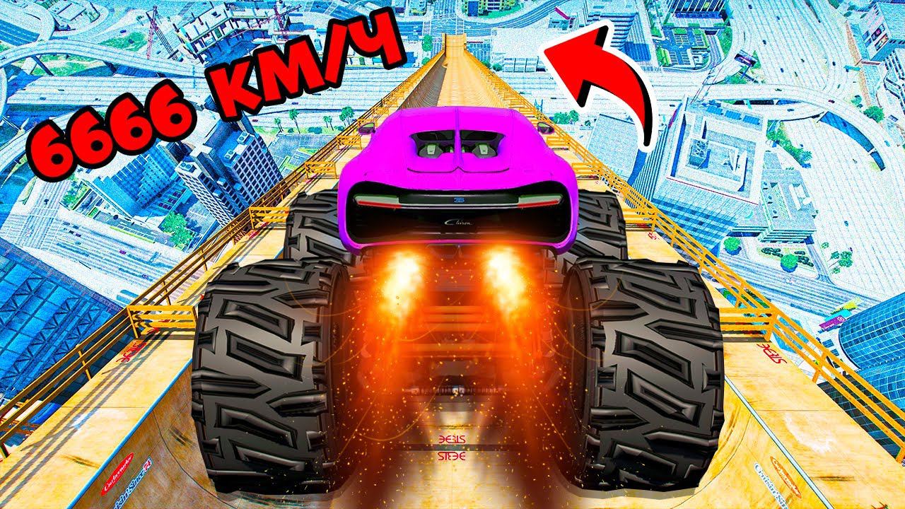 СПУСК БЕЗ ТОРМОЗОВ НА ГИГАНТСКОМ БУГАТТИ ЧИРОН ПО ТРАМПЛИНУ В ГТА 5 МОДЫ! ЭКСПЕРИМЕНТ GTA 5 МОД
