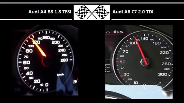 "Acceleration test 0-100 km/h Audi A4 B8 1.8 TFSI 160HP 250Nm 0-100 in 8.1s Source video: https://www.youtube.com/watch?v=1rSTAv2NlIY Audi A6 C7 2.0 TDI 190HP 400Nm 0-100 in 8.4s Source video: https://www.youtube.com/watch?v=EYqcu_GYEuU"