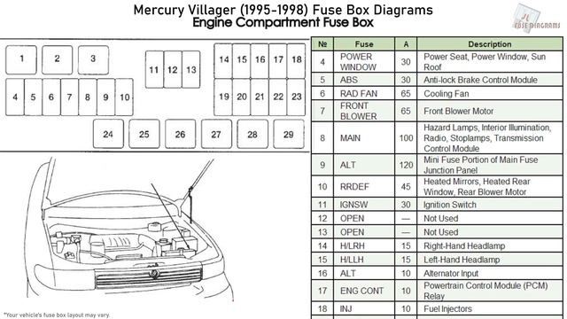 More about Mercury Villager fuses, see our website: https://fusecheck.com/mercury/mercury-villager-1995-1998-fuse-diagram Fuse Panel Diagram Minivan Mercury Villager LS & GS (1992, 1993, 1994, 1995, 1996, 1997, 1998)