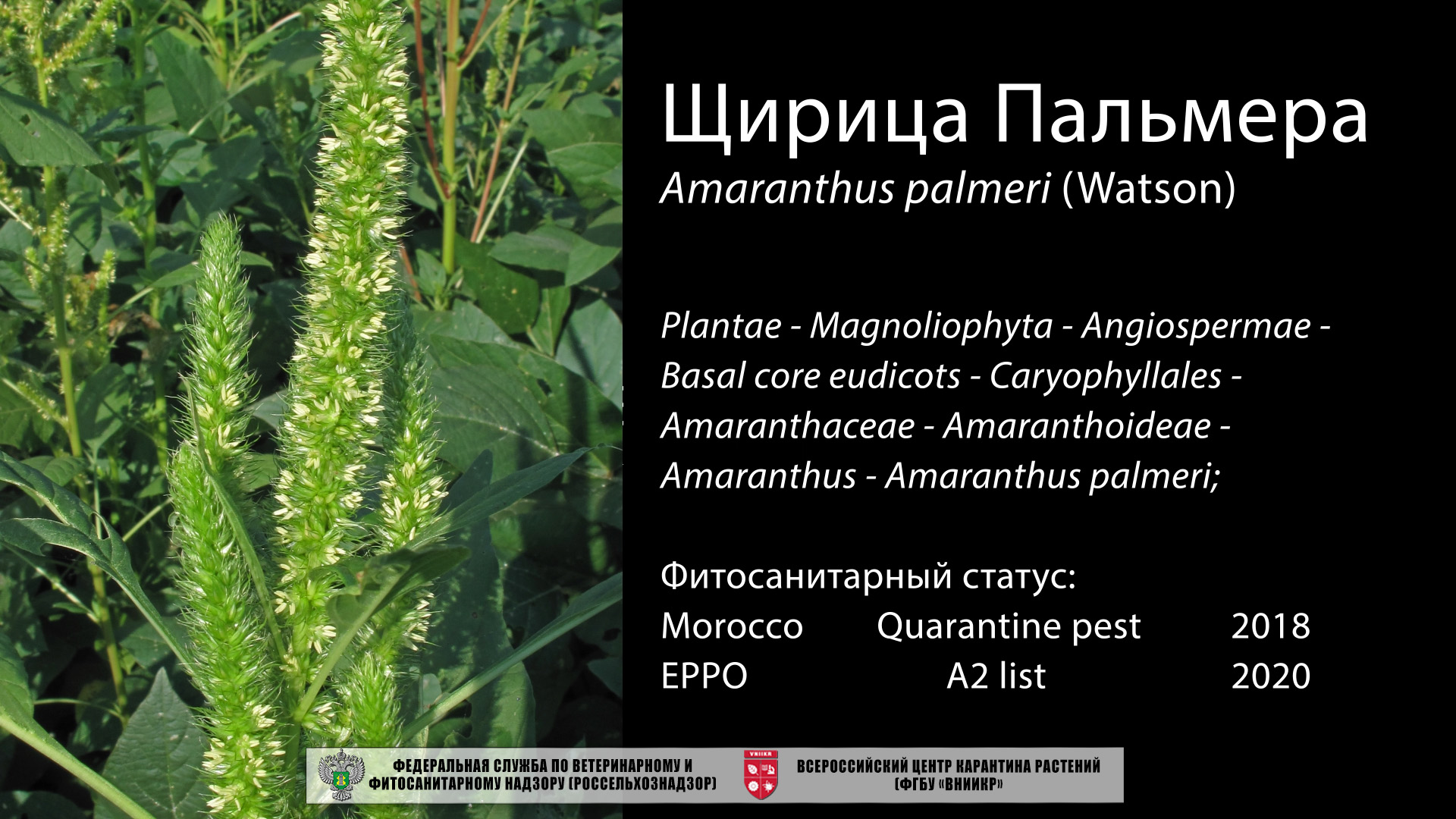 Амарантус Пальмера, по-другому, щирица Пальмера (Amaranthus palmeri) - злостное инвазивное растение, засоряющее сельскохозяйственные культуры. Сорняк произрастает в полях со многими культурами- зерновыми, хлопком, кукурузой, соей, арахисом, сладким картофелем, овощами