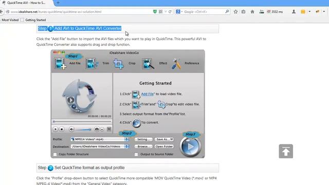 The following will describe a step by step guide on how to convert AVI to QuickTime more supported format with the help of the ideal AVI to QuickTime Converter on Mac or Windows at http://www.idealshare.net/itunes-quicktime/quicktime-avi-solution.html This guide applies to: Convert various AVI files to QuickTime format like convert AVI DivX to QuickTime, convert AVI Xvid to QuickTime, and convert AVI DV to QuickTime and etc; Convert other video or audio formats like WMV, MKV, VOB, FLV, MXF, AVCHD, 3GP, FLAC, OGG, WMA and etc to QuickTime supported format; Convert AVI to play AVI in iTunes/iPod/iPad/ iPhone/Apple TV or to edit AVI movies in iMovie, Final Cut Pro, Final Cut Express; Convert AVI to MOV, MP4, Apple ProRes, 3GP, WMV, MKV, MPEG-1, MPEG-2, ASF, VOB, FLV, DV, RM, TS, WebM, OGV and etc; Convert AVI to Apple Lossless ALAC, M4A, MP3, AIFF, WAV, AAC, AC3, AU, FLAC, RA, OGG, DTS and etc. Does QuickTime play AVI? Why QuickTime won't play AVI? Officially, QuickTime only natively plays AVI files encoded with Motion JPEG; QuickTime won't play AVI videos encoded with DivX, XviD, WMV and other video codecs. Though we can make QuickTime play more AVI types by installing Perian component, this only works on QuickTime with Mac OS X Snow Leopard or lower version, and it does work on QuickTime with Mac Yosemite, Mavericks, Mountain Lion and Lion.