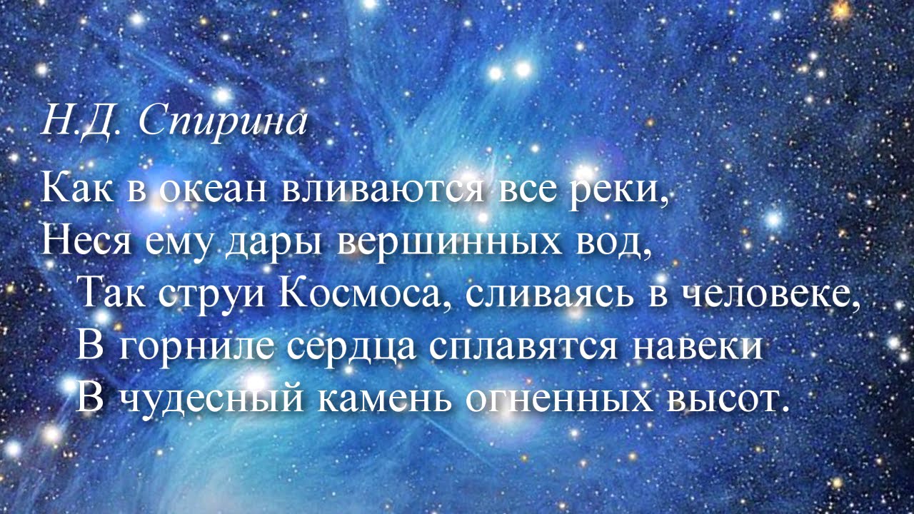Наталия Спирина * * * Как в океан вливаются все реки, Неся ему дары вершинных вод, Так струи Космоса, сливаясь в человеке, В горниле сердца сплавятся навеки В чудесный камень огненных высот. 24.06.1952 г. – 15.03.1954 г. Читает автор. #НаталияСпирина, #ПоэзияНовойЭпохи, #ПоэзияСпириной -------------------------------------------- О Наталии Дмитриевне Спириной: Сайт, посвященный Н.Д. Спириной: https://spirina.info Раздел на сайте СибРО: http://sibro.ru/teacher/spirina/ Instagram: https://www.instagram.com/nataliya.spirina/ Telegram: https://t.me/SpirinaN видеофильмы: https://www.youtube.com/playlist?list=PLRDwJtqWLAx7zdjQRW1u5QSUW3T6SJ4rj -------------------------------------------- Помочь проектам СибРО: https://sibro.ru/dari-dobro/ Благодарим наших постоянных помощников! -------------------------------------------- Канал Сибирского Рериховского Общества и Музея Николая Рериха в Новосибирске https://www.youtube.com/channel/UCOy_IPfEW_uKJU7lY6HwEaA Канал Трансляции СибРО https://www.youtube.com/channel/UCtl9xwOporefIWfINDnFlKQ Сайт: https://sibro.ru Группы: VK https://vk.com/roerichmuseumnsk OK https://ok.ru/roerichmuseum Книги издательства СибРО "РОССАЗИЯ": https://rossasia.sibro.ru/knigi/ Интернет-магазин "Искры Света": https://knigisibro.ru