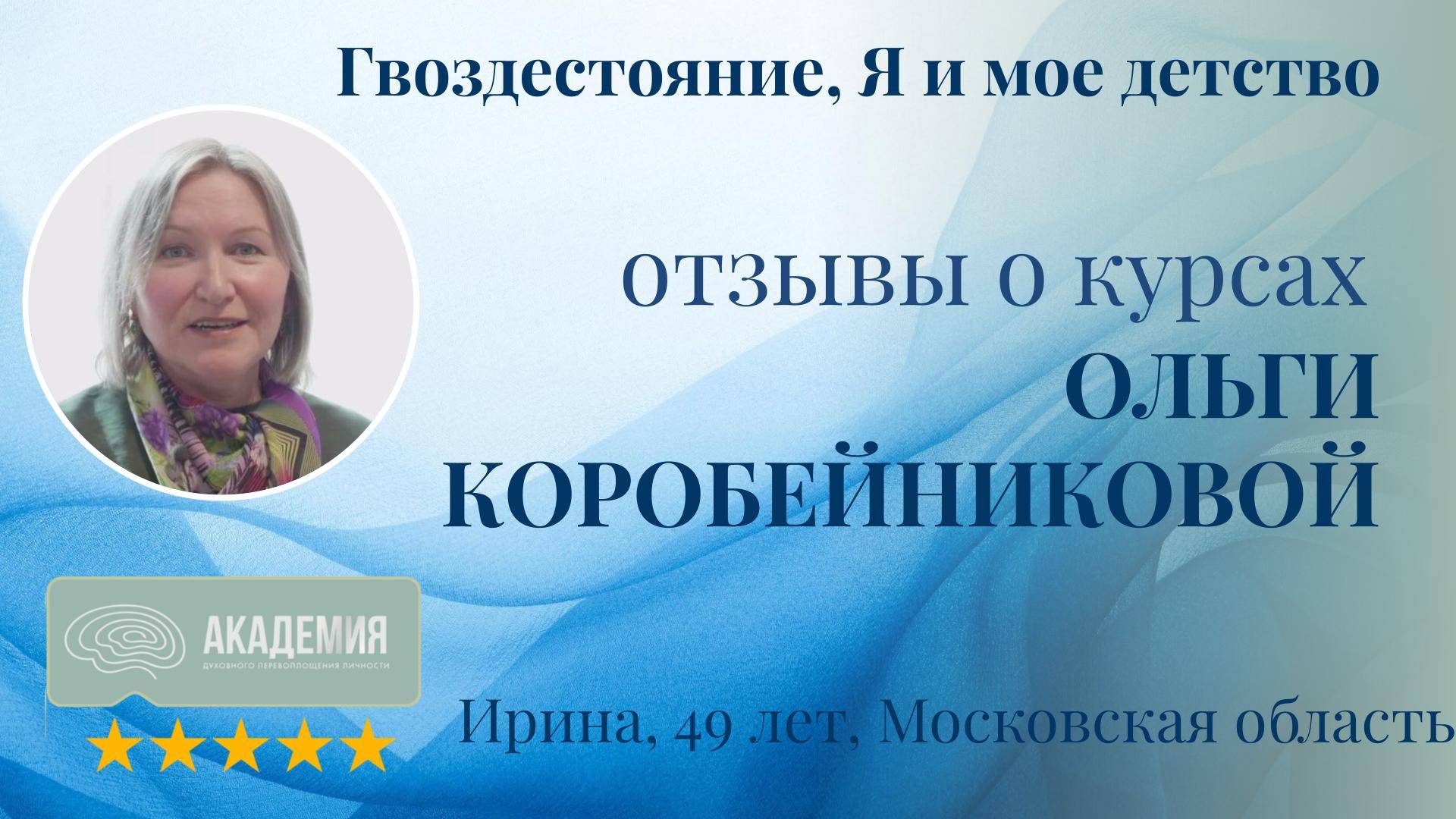 Отзывы о курсах Ольги Коробейниковой 26: "Гвоздестояние," "Я и мое детство" 26. Ирина, 49 лет, Московская область Точка А: Состояние до курса Интерес к новому: желание изучить психологию и философию, а также расширить поле деятельности. Ирина пришла на обучение со скептицизмом, но открыла для себя новое пространство и увидела в гвоздестоянии вызов самой себе. Путь к изменениям: Как курсы Ольги Коробейниковой помогли Регулярно занималась медитацией и практиковала гвоздестояние, что помогло глубже понять себя. Точка Б: Результаты после курсов Ольги Коробейниковой Открылся новый мир знаний, и появилось четкое понимание, в каком направлении двигаться дальше. Отзывы о курсах Ольги Коробейниковой показывают, что программы, такие как "Гвоздестояние" и "Я и мое детство," помогают участникам обрести ясность и расширить свои горизонты, направляя их к новым жизненным целям.