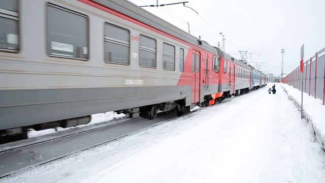 Сдвоенный электропоезд в составе ЭД9М-0115 + ЭД9М-0129 отправляется со станции Киров. Горьковская ж.д. 25.01.2015. Новая практика в пригородном сообщении, система следует до станции Зуевка, где будет расцеплена, 0115-я поедет в Глазов, а 0129-я вернется в Киров.