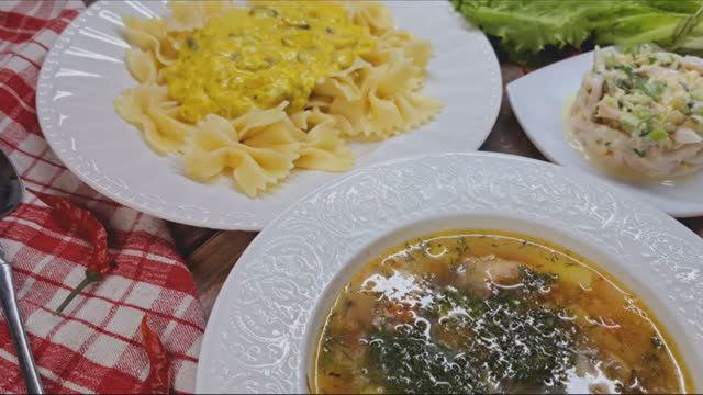 Нам понадобится: Суп с консервой!!! 1. Консерва (скумбрия, сайра) - 1 банка 2. Картофель - 2-3шт. (на ваш вкус, я люблю картошки побольше) 3. Морковь 4. Лук 5. Зелень 6. Специи - по вкусу Бантики с соусом из грибов с карри и сыром Сулугуни!!! 1. Макароны (любые, у меня бантики) - 1 пачка 2. Лук - 1шт. большая 3. Грибы - 300-350г 4. Сметана - 2ст. л. 5. Карри - 1ч. л. 6. Сулугуни - 280г 7. Соль - по вкусу Салат с кальмарами!!! 1. Кальмары - 1 банка (180г) 2. Солёный огурец - 1 маленький 3. Зелёный лук - по вкусу 4. Сыр твёрдый - 50г 5. Майонез - по вкусу