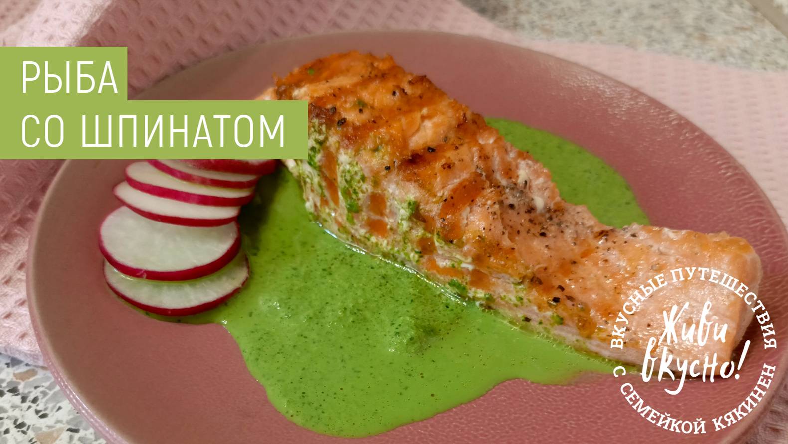 Ловите вкуснейший рецепт на все времена. Друзья, сегодня будем готовить рыбу чавычу, которую мы приобрели на рынке. Чавычу никогда в жизни не то, чтобы не готовили, а даже не ели никогда. Да, так тоже бывает. Рецепт простой, быстрый и ооооочень вкусный. Первым делом мы попросили продавца рыбы на рынке почистить рыбу и нарезать стейками. А дальше дело техники – приготовить соус из шпината и пожарить рыбу. Стейки мы располовинили и сняли с них кожицу. Посолили, поперчили. Обжарили на оливковом масле на сковороде-гриль до зажаристой корочки с одной стороны, перевернули (рыба очень нэжная, поэтому нужно очень аккуратно), и обжарили с другой стороны. И все – можно сервировать. Сначала соус из шпината, на него рыбку, рядом редиску и обязательно к блюду добавить немного отварного риса. Получилось прямо круто-круто. Никаких сушей и роллов не нужно.