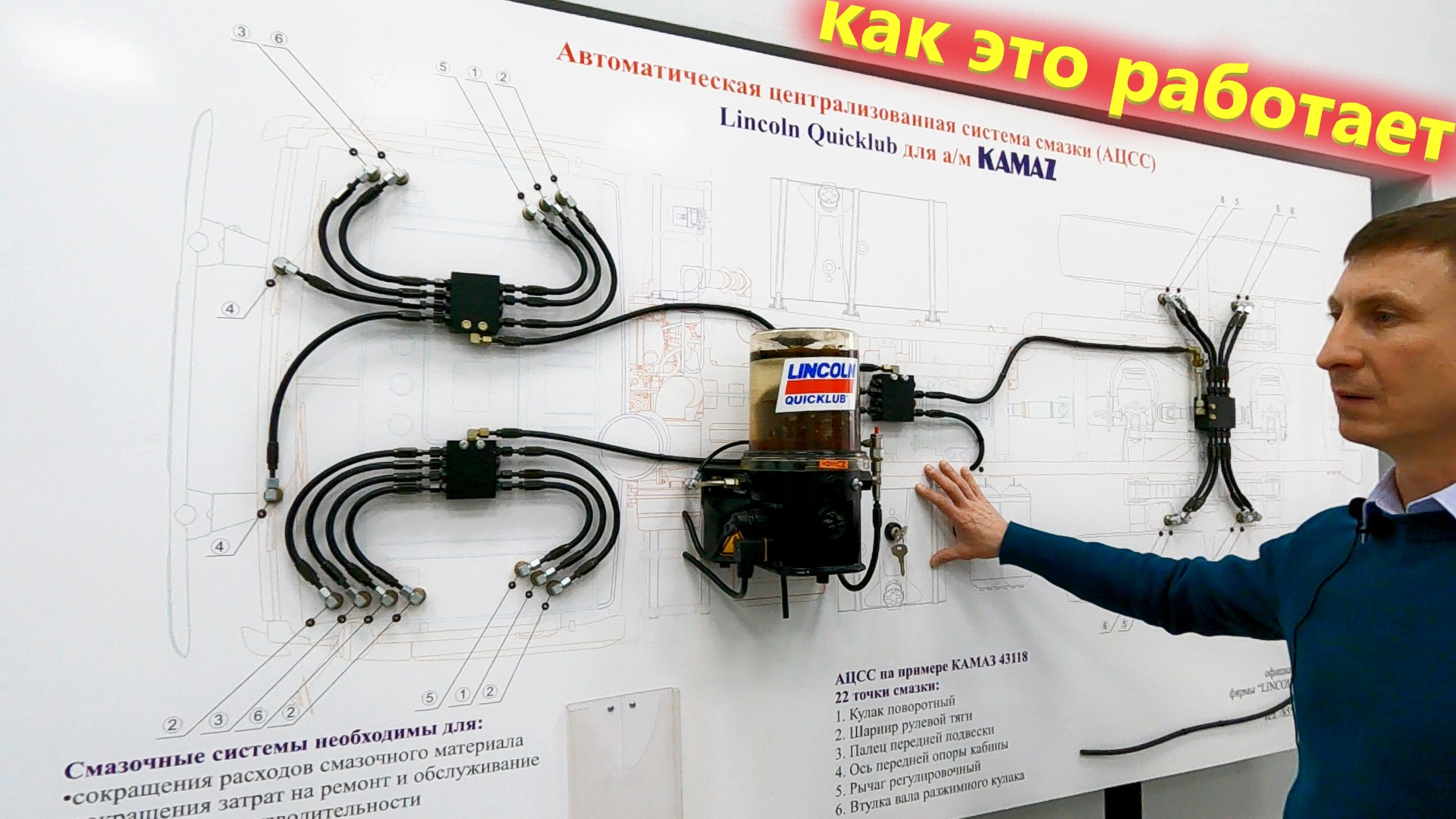 В этом видео пойдет речь про централизованную систему смазки lincoln. Думаю, большинство зрителей понимают, что такое консистентная смазка и для чего она применяется на грузовиках или спецтехнике. Для тех, кто не знает расскажу, консистентная смазка используется в сопрягаемых деталях автомобилей спецтехники, роботов, станков и т.д. Наверно проще сказать где ее нет. Традиционно для смазки трущихся поверхностей используется специальный пистолет, который нагнетает смазку через специальные пресс масленки имеющие встроенный обратный клапан. Иногда на одном грузовике может быть несколько десятков таких точек смазки, что очень затрудняет процесс контроля и смазки трущихся поверхностей. Для облегчения обслуживания дорогостоящей техники была придумана централизованная система смазки, которая призвана: уменьшить расход смазки; уменьшить трудозатраты на обслуживание техники в процессе эксплуатации; увеличить срок службы трущихся узлов. В этом видео мы рассмотрим, как устроена централизованная система смазки Камаз. Директор предприятия Линкор ТС Фаниль расскажет, как работает система смазки линкольн. В основе всей системы находится насос централизованной смазки, который совмещен с электронным блоком управления. Электроника позволяет настраивать периоды и продолжительность смазки. К примеру, на автомобиле Камаз продолжительность смазки составляет 4 минуты, а периодичность 12 часов. За один цикл работы такой системы смазки через узлы грузовика продавливается примерно 12 кубических сантиметров консистентной смазки. По заверениям представителя компании система централизованной смазки позволяет увеличить ходимость узлов грузовиков и спецтехники в 3-4 раза. От насоса Линкольн смазка по специальным трубопроводам поступает к распределителям, а оттуда уже к смазываемым узлам. На КАМАЗе который был в обзоре было 22 точки смазки. Грузовик в составе большой партии машин закупила компания Норильский никель. Фаниль рассказал, что централизованная смазка линкольн не является монополистом, хотя и удерживает лидирующие позиции на мировом рынке. Оказывается, есть и отечественные производители автоматических централизованных систем смазки, но они пока малоизвестны. К самой консистентной смазке, используемой в централизованных смазывающих системах предъявляются особые требования. Смазка должна обладать необходимыми смазывающими свойствами при высоких и низких температурах и при этом не вытекать из узла в жаркую погоду и обеспечивать проходимость по трубопроводам при отрицательных температурах. В этом плане директор компании Линкор ТС рекомендует использовать смазки Российского производства от компании Smazka.ru. Этот производитель входит в концерн ВМП Авто и зарекомендовал себя с хорошей стороны. У меня на канале было видео с производства этих смазок, лично у меня сложились самые положительные впечатления. Особенно меня поразил глубокий научный подход к производству смазок. У ребят есть специальная лаборатория, в которой они проводят моделирования различных климатических ситуаций и их воздействия на смазку и на трущиеся узлы. Пишите свой опыт использования систем централизованной смазки на грузовиках и спецтехнике.