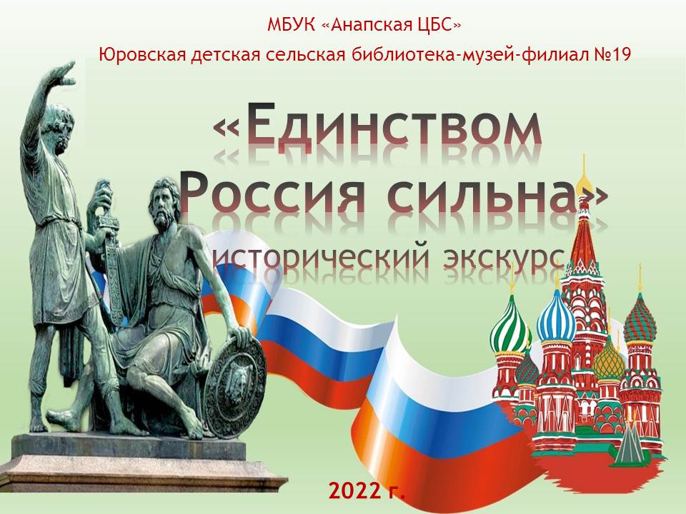 С 2005 года 4 ноября в России стал отмечаться новый государственный праздник - ДЕНЬ НАРОДНОГО ЕДИНСТВА Наша страна многонациональна. История нашей страны богата примерами, когда именно единение всего народа во имя блага и процветания России открывало путь к укреплению государства, её независимости, развитию общества, сохранению культурно – исторического наследия. Соединяет людей и народы дружба. Вместе они живут счастливо. Родина, единство, духовность…Такой глубокий смысл заложен в празднике. Мы не должны забывать уроков истории: сильна Россия только тогда, когда она едина! Наша сила ещё и в добре. Доброделание – основа нашего бытия и одна из главных идей наступающего праздника. Творите добро, и мы придем к духовному оздоровлению всего общества! Именно поэтому в нашей стране есть такой важный праздник – День народного единства. Подготовил главный библиотекарь Юровской детской сельской библиотеки-музея-филиала №19 И.А.Матюшова