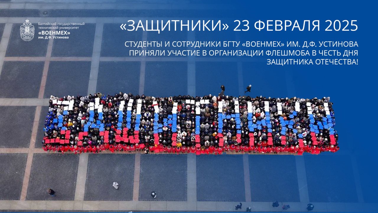 Студенты и сотрудники БГТУ «ВОЕНМЕХ» им. Д.Ф. Устинова приняли участие в организации флешмоба в честь Дня защитника Отечества! Сегодня утром для участия в акции на Дворцовой площади собралось более 700 студентов и сотрудников нашего университета. Участники флешмоба выстроились в российский триколор, а затем в слово «Защитники». Таким образом молодые люди поздравили всех жителей нашей страны со знаменательным праздником. Мы поздравляем с 23 февраля наших защитников. Ветеранов, участников специальной военной операции – всех, кто защищал и защищает границы нашей Родины. Низкий вам поклон!