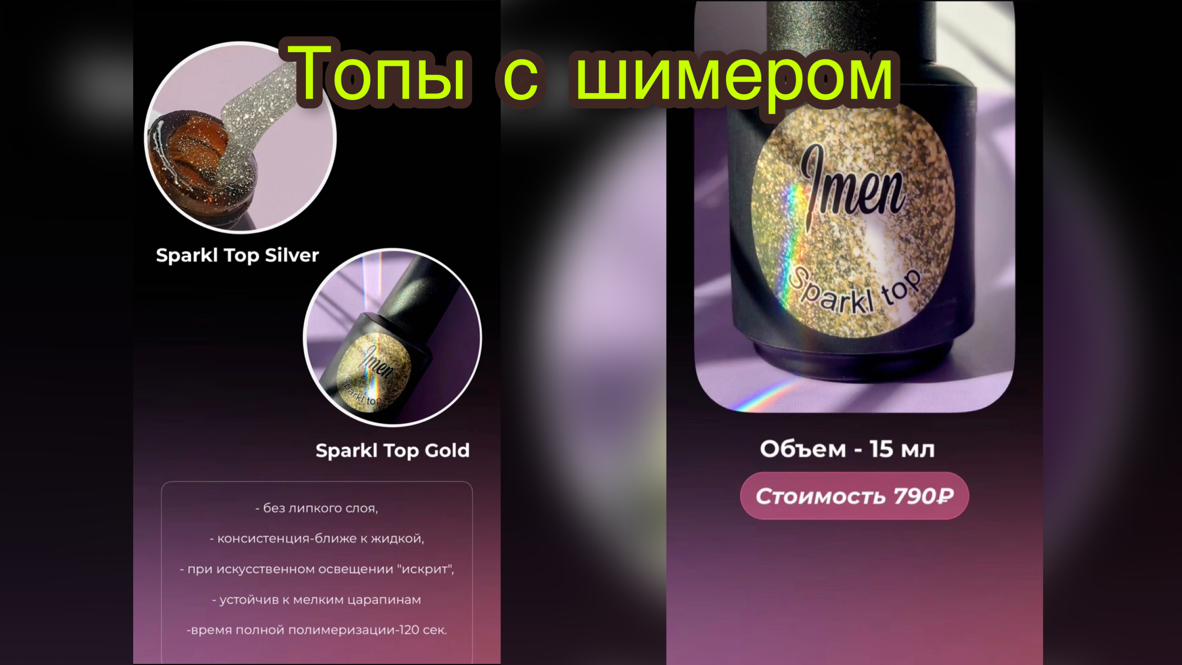 ВСЕМ ПРОДУКТИВНОЙ НЕДЕЛИ! знакомы с нашими топами с шимером❓ Sparkl Top Silver Sparkl Top Gold - без липкого слоя, - консистенция-ближе к жидкой, при искусственном освещении "искрит", - устойчив к мелким царапинам -время полной полимеризации-120 сек. Объем - 15 мл Стоимость 790 Р ГДЕ КУПИТЬ? магазин-склад в Москве ул.Кутузовский просп.67 корп.1 8-926-215-43-52 каждый день с 10 до 19.00 WILDBERRIES Silver - арт.33086347 https://www.wildberries.ru/catalog/33086347/detail.aspx?targetUrl=MS&size=70592750 Gold- арт. 66875423 https://www.wildberries.ru/catalog/66875423/detail.aspx?targetUrl=MS&size=115982349 Онлайн магазин www.imennails.ru