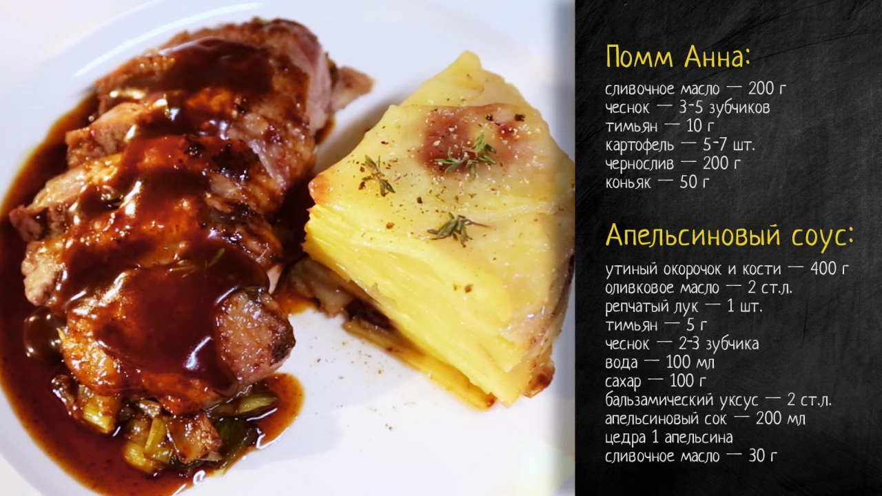 Ингредиенты: сливочное масло – 200 г чеснок – 3-5 зубчиков тимьян -10 г картофель – 5-7 шт. чернослив – 200 г коньяк – 50 г Приготовление: Для Помм Анны растопите сливочное масло, добавьте в него тимьян и чеснок. Чернослив предварительно замочите в коньяке минимум на 20 минут. Картофель нарежьте тонкими кружочками. Дно формы выстелите пергаментом. Каждый ломтик картошки окунайте в растопленное масло и выкладывайте на пергамент слоями, на каждый слой выложите порезанный кусочками чернослив. Все слои залейте оставшимся сливочным маслом и запекайте в духовке вместе с уткой – примерно час. Картошка не впитает сливочное масло, а будет в нем тушиться. Из готовой запеканки масло лучше слить.