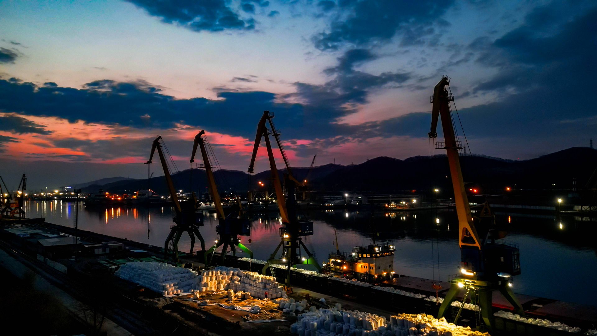 рассвет над портом Находка (Рыбный порт, мыс Астафьева) и огни раннего утра