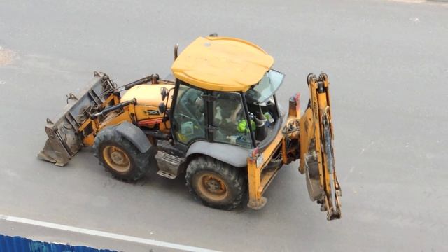 Экскаватор погрузчик убирает бордюрные ненужные блоки с дороги