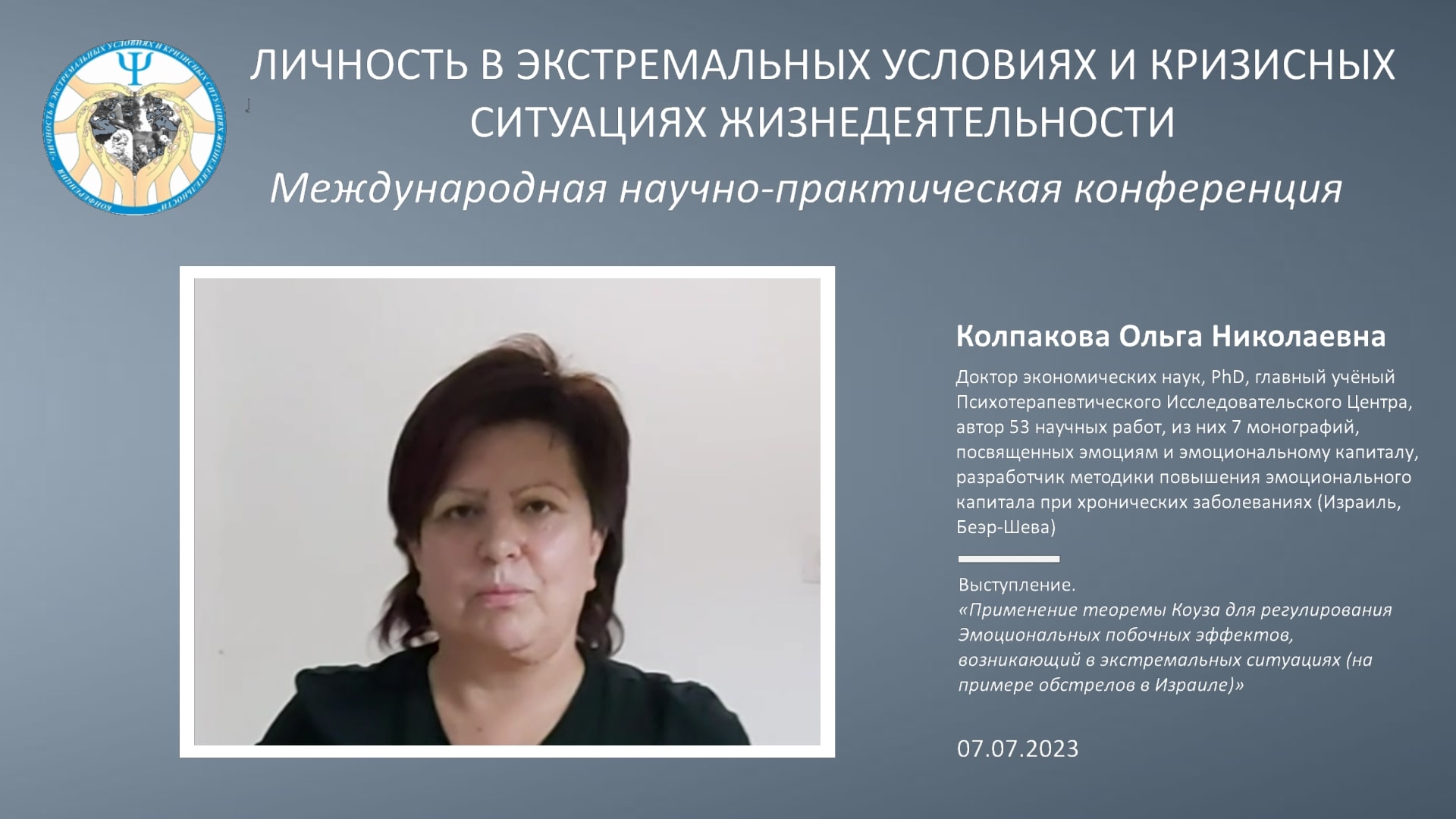 Международная научно-практическая конференция (07.07.2023) Программа 7 июля Порядок выступающих смотрите в программе конференции: https://lichextrim.ru/7july Колпакова Ольга Николаевна Доктор экономических наук, PhD, главный учёный Психотерапевтического Исследовательского Центра, автор 53 научных работ, из них 7 монографий, посвященных эмоциями эмоциональному капиталу, разработчик методики повышения эмоционального капитала при хронических заболеваниях (Израиль, Беэр-Шева) Звоните, задавайте вопросы: - Skype: hembra7 - E-mail: kaif.olga@yandex.com