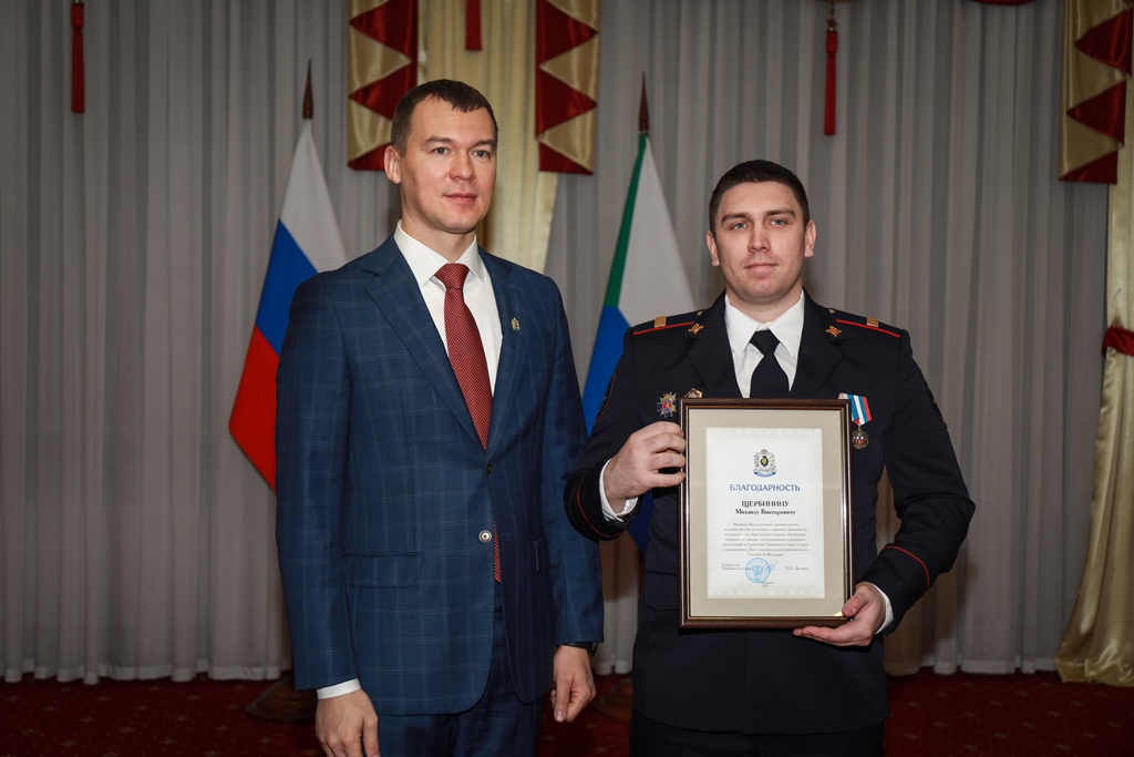 ⚡️В доме правительства Хабаровского края прошла торжественная встреча губернатора Михаила Владимировича Дегтярева (https://xn--d1aumdd.xn--b1aew.xn--p1ai/news/item/33651799/) с руководителями, сотрудниками и ветеранами органов внутренних дел края. ?Михаил Владимирович в своем выступлении отметил, что чётко отлаженная система работы органов внутренних дел играет важную роль в социально-экономическом развитии Хабаровского края. Безопасность населения и возможность экономического развития региона, приток инвестиций зависит от многих не всегда заметных, но всегда добросовестно исполненных дел полицейских. Борьба с преступностью, терроризмом и коррупцией, обеспечение безопасности на дорогах и много другое требует от каждого сотрудника органов внутренних дел высочайшего профессионализма, постоянной бдительности и готовности рисковать своей жизнью, охраняя закон и порядок. ?Сотрудники Хабаровского ЛУ и Комсомольского ЛО МВД России на транспорте получили из рук Губернатора грамоты и благодарности.