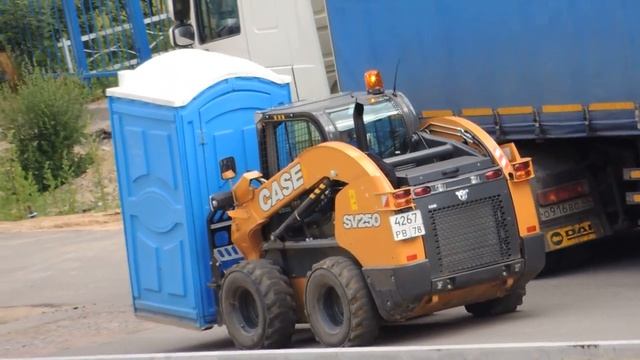 Мини погрузчик перевозит биотуалет