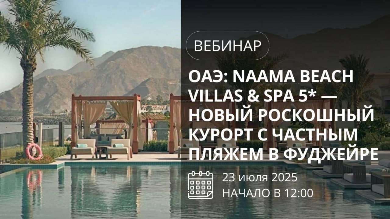 Naama Beach Villas&Spa 5* - уединённый курорт всего в 1,5 часах езды от Дубая: ✔ Просторные виллы с личным бассейном и джакузи ✔ Обслуживание 24/7, сауна, хаммам, спа и ресторан высокой кухни ✔ Частный пляж, йога с видом на горы, круизы, дайвинг, трекинг ✔ Идеальное место для романтики, восстановления и красивой жизни Обо всех достоинствах и особенностях продаж Naama Beach Villas&Spa 5* нам расскажет представитель курорта в России - Лиза Флорат. Присоединяйтесь, это будет интересно!