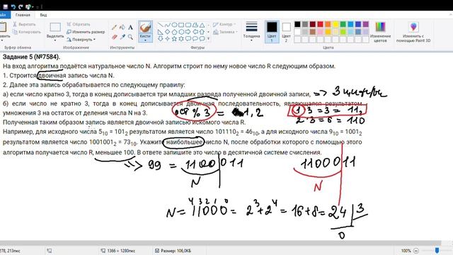 Больше видео на моем сайте https://xn--b1aga7bdp8a.xn--p1ai/ Хотите легко и просто понять информатику? Пишите мне в директ https://www.instagram.com/kselt_/ Больше видео по математике и информатике на моем канале https://www.youtube.com/channel/UCD7m... Подписывайтесь, чтобы не пропустить новинки. № 7584 Досрочная волна 2023 (Уровень: Средний) На вход алгоритма подаётся натуральное число N. Алгоритм строит по нему новое число R следующим образом. 1. Строится двоичная запись числа N. 2. Далее эта запись обрабатывается по следующему правилу: а) если число кратно 3, тогда в конец дописывается три младших разряда полученной двоичной записи, б) если число не кратно 3, тогда в конец дописывается двоичная последовательность, являющаяся результатом умножения 3 на остаток от деления числа N на 3. Полученная таким образом запись является двоичной записью искомого числа R. Например, для исходного числа 510 = 1012 результатом является число 1011102 = 4610, а для исходного числа 910 = 10012 результатом является число 10010012 = 7310. Укажите наибольшее число N, после обработки которого с помощью этого алгоритма получается число R, меньшее 100. В ответе запишите это число в десятичной системе счисления.