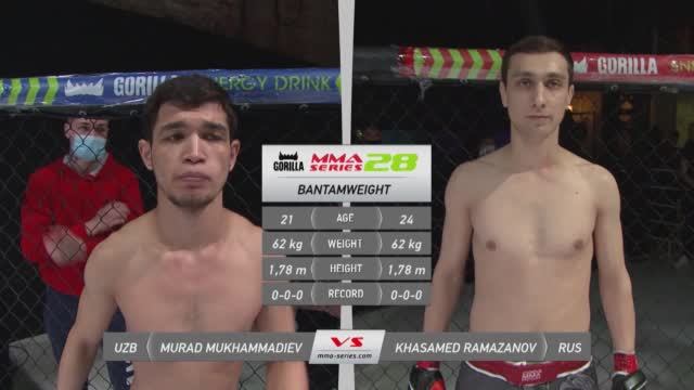 Турнир: Горилла ММА Серия-28 Город проведения турнира: Санкт-Петербург Боец синего угла: Мурад Мухаммадиев (Узбекистан) Боец красного угла: Хасамед Рамазанов (Россия) Победитель: Мурад Мухаммадиев Способ победы: Сабмишен