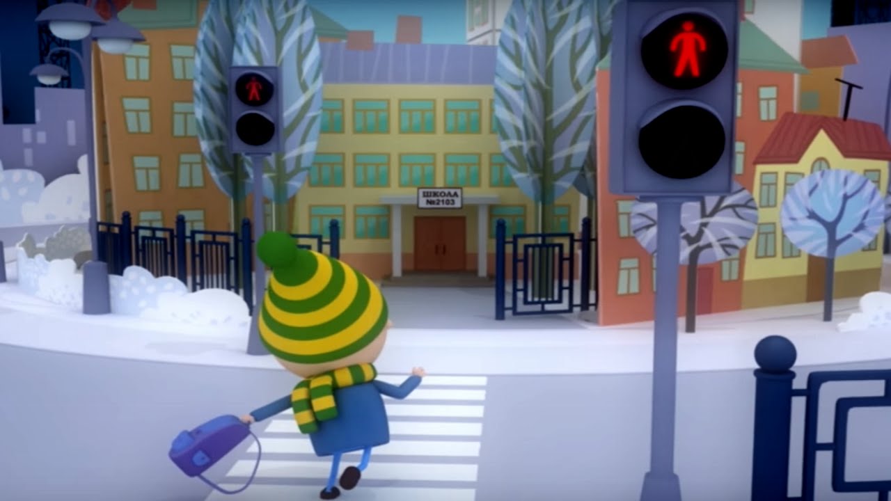 Как-то Саша утром в понедельник пошёл в школу. На пути он погонял ворон, кинул снежок в снеговика, покатался на горке и только после этого вспомнил, что уже начался урок. Так как Саша опаздывал, он решил перебежать дорогу на красный свет светофора. Но разве он правильно поступил? Давай смотреть и всё узнаем!