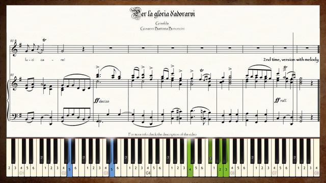 🎼 🎻🎹 Video score for "Per la gloria d'adorarvi" from the Ópera "Griselda" by Giovanni Battista Bononcini (1670 - 1747), from Parisotti's collection "24 Italian songs and arias for medium high voice" version for piano accompaniment 🎼 🎻🎹 Lyrics. Per la gloria d’adorarvi voglio amarvi, o luci care. Amando penero, ma sempre v’amerò, sì, sì, nel mio penare, penerò, v’amerò, luci care. Senza speme di diletto vano affetto è sospirare, ma i vostri dolci rai chi vagheggiar può mai e non, e non v’amare? penerò, v’amerò, luci care! English translation. For the glory of adoring you I want to love you, oh dear eyes. In love I will suffer, yet always I will love you, Yes, in my suffering: I will suffer, I will love you, dear, dear eyes. Without a hope of pleasure It is vain affection to sigh, Yet your sweet glances: Who can ever admire them, No, and not love you? I will suffer, I will love you, dear, dear eyes. Traducción al español. Por la gloria de adorarlos quiero amarlos, ¡Oh, queridos ojos! Amando sufriré, pero siempre los amaré. Sí, sí, en mi sufrir. Sufriré, los amaré, queridos ojos. Sin esperanzas de deleite, vano afecto es suspirar. Pero sus dulces rayos… ¿Quién podría contemplarlos y no amarlos? Sufriré, los amaré, queridos ojos. Notice. * Partituras Interactivas is a channel for creating and sharing video-scores of musical pieces used around the world for musical training. * All the musical pieces used for content creation are from PUBLIC DOMAIN. * All the content (video and audio) shared in this channel is originally created, edited and produced by Partituras Interactivas. Aviso importante. * Partituras interactivas es un canal dedicado a crear y compartir video-partituras utilizadas a nivel mundial para el entrenamiento musical en las academias. * Todas las piezas musicales (partituras) utilizadas como fuente para la creación de contenido pertenecen al DOMINIO PÚBLICO. * Todo el contenido audiovisual compartido en este canal es originalmente creado, editado y producido por Partituras Interactivas. 𝗗𝗼𝗻'𝘁 𝗳𝗼𝗿𝗴𝗲𝘁 𝘁𝗼 𝘀𝘂𝗯𝘀𝗰𝗿𝗶𝗯𝗲 𝗳𝗼𝗿 𝗺𝗼𝗿𝗲 𝗰𝗼𝗻𝘁𝗲𝗻𝘁! (𝗡𝗼 𝗼𝗹𝘃𝗶𝗱𝗲𝘀 𝘀𝘂𝘀𝗰𝗿𝗶𝗯𝗶𝗿𝘁𝗲 𝗽𝗮𝗿𝗮 𝗼𝗯𝘁𝗲𝗻𝗲𝗿 𝗺á𝘀 𝗰𝗼𝗻𝘁𝗲𝗻𝗶𝗱𝗼) https://www.youtube.com/channel/UCXW_hkr4WV6Pcii2tt05oiw?sub_confirmation=1 Facebook: https://www.facebook.com/PartiturasInteractivas/ Instagram: https://www.instagram.com/partiturasinteractivas/ Twitter: https://twitter.com/PInteractivas Paypal: https://www.paypal.me/PInteractivas/5 ------------------------------------ Este canal te ofrece contenido musical tomado de partituras en pdf de dominio público alojadas en la biblioteca imslp.org para el estudio riguroso de obras para diversos instrumentos musicales tales como la voz, piano, flauta entre otros. Los videos se componen de la partitura animada mostrando la nota y la letra de cada obra, además, en un piano se indican las notas que se van interpretando, así como la escala según la tonalidad de la obra y los grados de cada tonalidad, o bien puedes encontrar posiciones de instrumentos como la flauta dulce. Este canal se preocupa por entregarte material innovador y de calidad que responda a la diversidad de intérpretes que deseen seguirnos, por lo que podrás encontrar las obras en varias tonalidades disponibles según te acomode, y una alta calidad audiovisual! Ven, visítanos y si te gusta lo que ofrecemos, suscríbete y activa notificaciones para recibir siempre actualización de nuestro contenido.