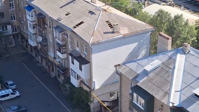 На крыше 20 дома на бульваре Пушкина в Донецке висит шифер, может упасть кому-то на голову