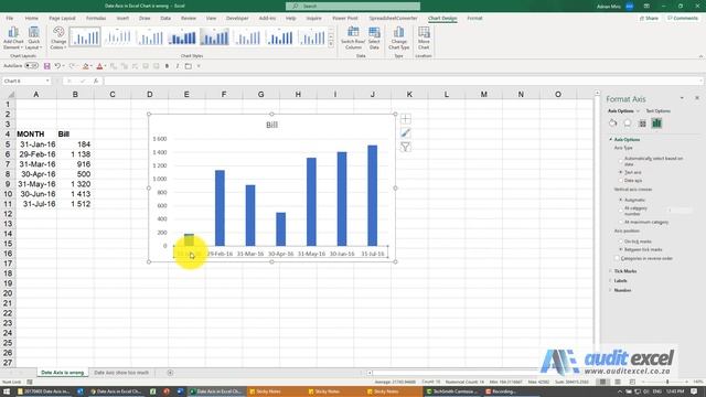 From https://www.auditexcel.co.za/blog/date-axis-in-excel-chart-is-wrong/ Images on website You’ve built your chart, it all makes sense and suddenly you look at your horizontal axis, and the date axis is wrong. This happens a lot. You expect to see the dates you have in the data but different dates are showing, normally the beginning of month date instead of the end of month date. ------------------------------------------------------------------------------------------------------------------------------------------------------ ✅- Free check of your Excel Skill Level- https://excel-skills-assessment.com/skills-assessment/ ?- Test employee Excel skill levels- https://excel-skills-assessment.com/excel-skills-test-for-employment/ ?- Improve you Excel Skill Levels- https://online-excel-training.auditexcel.co.za/course-category/skill-based-beg-int-adv/ ??- Our main website- https://www.auditexcel.co.za/blogs/ ------------------------------------------------------------------------------------------------------------------------------------------------------ ⏲Time Stamps 00:00 Dates missing or large gaps in Excel axis of chart 00:23 Show the missing dates on chart 00:58 Remove the gaps between dates ------------------------------------------------------------------------------------------------------------------------------------------------------ Date Axis in Excel Chart is wrong- the issue As shown below, the data clearly shows month end dates (31 Jan 2016) but the chart is showing the beginning of the month (1st Jan 2016) on the horizontal axis of the chart. This may seem like an error but it is actually a feature. The key is to understand that if Excel sees a valid date (e.g. the 31 Jan 2016) it will open up new options in some of its tools and charts are one of them. Date Axis in Excel Chart is wrong If you right click on the horizontal axis and choose to Format Axis, you will see that under Axis Type it has 3 options being Automatic, text or date. As we have entered valid dates in the data the Automatic chooses dates and therefore you get the option in the second box. If Excel sees valid dates it will allow you to control the scale into days, months or years. Date Axis in Excel Chart is wrong So if, instead of having the Base unit as Months, I change it to Days the Chart will adjust the axis to show the data points on a chart that has a daily scale. So below you can see the gaps in days between the points. Date Axis in Excel Chart is wrong If I choose years it collapses the time period into years. Date Axis in Excel Chart is wrong How to force Excel to use your typed in dates in a chart Although this feature is useful, sometimes you just want Excel to show the dates you typed. In order to do this you just need to force the horizontal axis to treat the values as text by right clicking on the horizontal axis, choose Format Axis Change Axis Type to be Text Note that you immediately lose the scaling options and the date scale puts in exactly what is in the data, onto the horizontal axis.