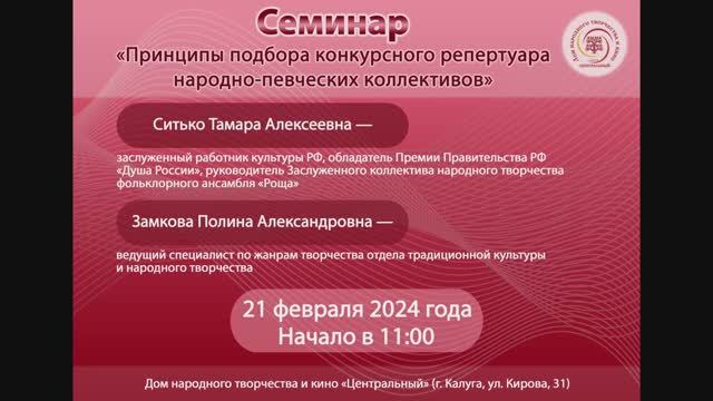 Семинар "Принципы подбора конкурсного репертуара народно-певческих коллективов". Калуга, февраль 2024 г.