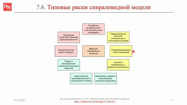 Словарь «Термины и определения корпоративных информационных систем и ERP-систем». Ключевые слова: спиралевидная модель ПО, риски проекта, нереалистичные сроки, перфекционизм, дефицит ресурсов, непрекращающийся поток изменений, недостаточная производительность, внешние ресурсы, внешние компоненты. Ссылка: https://stepanovd.com/training/15-lifecycle