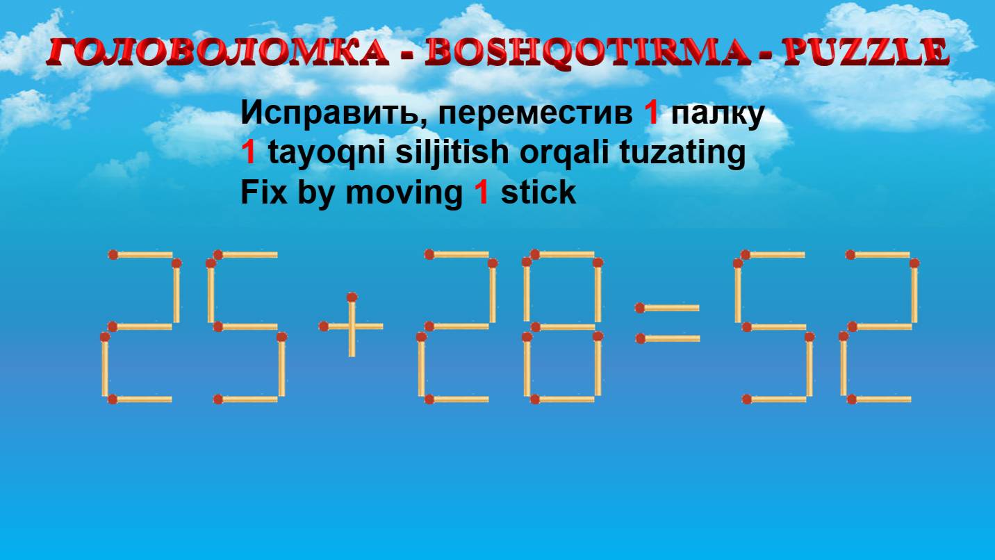 ГОЛОВОЛОМКА - BOSHQOTIRMA – PUZZLE. Спичка. 25+28=52, 29+59=92, 32+54=98, 62+26=80