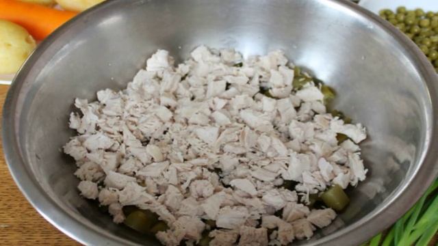 Салат "Оливье" с зеленым луком и домашним майонезом. Рецепт простой, но очень удачный. Лук освежает салат и придает ему пикантность, попробуйте, это очень вкусно. Ингредиенты: Картофель3 штуки, Морковь1 штука, Яйца4 штуки, Огурцы соленые4-5 штук, Горошек200 грамм(консервированный), Майонез домашний200 мл, Куриная грудка1 штука, Лук зеленый1 пучок, Благодарим за просмотр! Подписывайтесь на канал🍕 Поделитесь своим мнениенм о рецепте в комментариях!