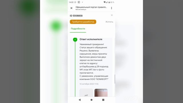 Всем добрый день. Очередной ответ от уо ООО Комфорт через сайт ЕДС МО или теперь Добродел дом - незаконные РАЗБИТЫЕ ЗЕРКАЛА убрали, стену с дырами привели в надлежащее состояние, остался вопрос только с ПСЕВДО рисунком берёзки на трубе на общедомовом имуществе. Если вам хочется рисовать - то есть в городе БЕСПЛАТНО секции или кружки, и НЕ НУЖНО это делать в подъезде! Это уже ВАНДАЛИЗМ! Всем лёгкой рабочей недели.