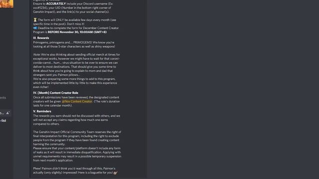 [OPEN] December Content Creator Program December Content Creator Program is NOW OPEN! Travelers! The Content Creator Program is available from November 28, 10:00 AM (GMT+8) and until November 30, 10:00AM (GMT+8)!!! Paimon recommends for you check out the requirements before applying~ Application - https://forms.gle/FWGxR2KTX6BrcWzD7 I. Requirements for each category (A) YouTubers: • 4 videos/month minimum Bonus! Include Genshin Impact Social Links in your description which can be found in: #social-media-links Link your YT to your Discord account! Streamers: • 20 hours/month + avg. of at least 50 concurrent viewers Link your Twitch/YouTube/Facebook to your Discord account. Please ensure your VODs are available for public viewing. Guide/Article Writers: • Interesting content with a reasonable length and ILLUSTRATIONS! Please make it nice for others to read! Community Website/Database Creators: • Website/Database address • Proof of Ownership via Image upload (Paimon will follow up) • A list of up to 10 contributors maximum, including self with respective UIDs and Discord names • A log of the monthly updates implemented I. Requirements for each category (B) Artists: • 3 pieces/month on Twitter/Instagram Bonus! Create artwork celebrating a Character’s birthday or an in game festival/event! Link your Twitter, if you use Twitter, to your Discord account! SFW Accounts ONLY, please! Cosplayers: • 1 post on Twitter/Instagram for each new cosplay Bonus! Stream in your Cosplay! Link your Twitter/Instagram/Stream to your Discord account. SFW Accounts ONLY, please! II. Application Process Complete the Google form every month in order to apply for eligibility or renewal. Ensure to ACCURATELY include your Discord username (Ex: xxx#1234), your UID (Number in the bottom right corner of Genshin Impact), and the link(s) to your social channel(s). The form will ONLY be available few days every month (see specific time in the post). Don’t miss it! :mega: Deadline to complete the form for December Content Creator Program is BEFORE November 30, 10:00AM (GMT+8) III. Rewards Primogems, primogems and…. PRIMOGEMS! We know you’re looking at all those 5-star characters as well as shiny weapons! Note: We’re also thinking about sending official merch at times for exceptional works, however we might have to wait for that coroni-covida-carrot… hum… virus situation to be over to ensure we can deliver to most destinations. That should give you some time to think about how you’re going to explain to mom and dad that strangers sent you Paimon pillows... We’re also preparing some more things to add to this program, which will be implemented little by little to make this experience even richer! IV. [Month] Content Creator Role Once all submissions have been reviewed, the designated content creators will be given @Nov Content Creator. (The role's duration lasts for one calendar month). V. Reminders The rewards you earn should not be discussed with others, and we will not accept any claims regarding how much one earns compared to others. The Genshin Impact Official Community Team reserves the right of final interpretation for this program, including the right to exclude people from the program if they have been found creating content harming the community. Please ensure that your content/platform doesn't include any form of leaks as it will result in immediate disqualification. Applying with unmet requirements may result in a possible temporary suspension from next month's application. ▷ Playlist for this series: 🎬https://www.youtube.com/playlist?list=PLs9Tu3qL5-GDlDylemT2OaawZS8uqmdKI -------------------------------- ☕ Buy Air a coffee to support: https://www.buymeacoffee.com/Airyuken 🔴 Quick Donation: https://www.paypal.com/donate?hosted_button_id=DY27N26JS9ZEQ -------------------------------- Services: ⚡ PvP or PvE - LangrisserM - https://forms.gle/gDbLY5XC3BAQUdA97 ⚡ Youtube Thumbnails - https://forms.gle/g6xBKwnJFWWP98jKA For those who would like the above services fill out the above google forms and for further inquiries contact me via discord pm @ Air#1123 -------------------------------- 🌟 FOLLOW ME 🌟 📣Twitch: https://www.twitch.tv/TheAirRyu 📣Discord: https://discord.gg/2vbnA3N6zT 📣Facebook: https://www.facebook.com/TheAirRyu 📣Twitter: https://twitter.com/TheAirRyu #GenshinImpact #GenshinImpactNews #GenshinImpactGuide