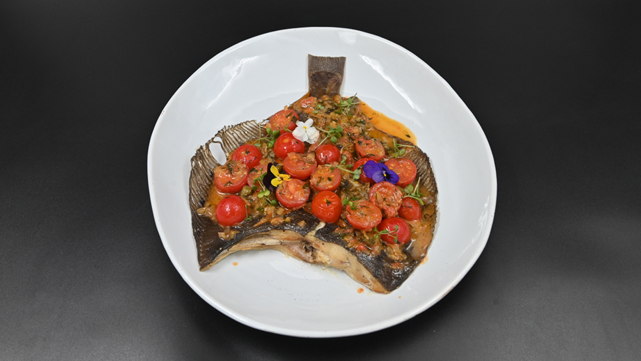 Камбала в соусе аква пацца с томатами черри