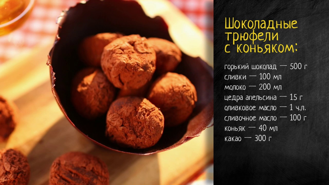 Ингредиенты: горький шоколад – 500 г сливки – 100 мл молоко – 200 мл цедра апельсина – 15 г оливковое масло – 1 ч.л. сливочное масло – 100 г коньяк – 40 мл какао – 300 г Приготовление: 200 г горького шоколада растопите на водяной бане – он нам понадобится чуть позже. Смешайте сливки, молоко и апельсиновую цедру и доведите до кипения. Когда смесь закипит, процедите ее прямо в миску с оставшимся шоколадом. Шоколад начнет таять - аккуратно смешайте все блендером. Важно, чтобы при смешивании в шоколад не попал воздух. Чтобы смесь быстрее застыла – можно взбивать ее на льду. Сюда же добавляем сливочное и оливковое масло и коньяк. Формируем небольшие шарики – наши будущие трюфели – и убираем их в холодильник на час. Застывшие трюфели окунаем в растопленный шоколад и сразу в какао – нужно чтобы какао полностью прилипло к шоколаду. Охлаждаем трюфели еще хотя бы час, а потом удаляем лишнюю обсыпку – и готово!