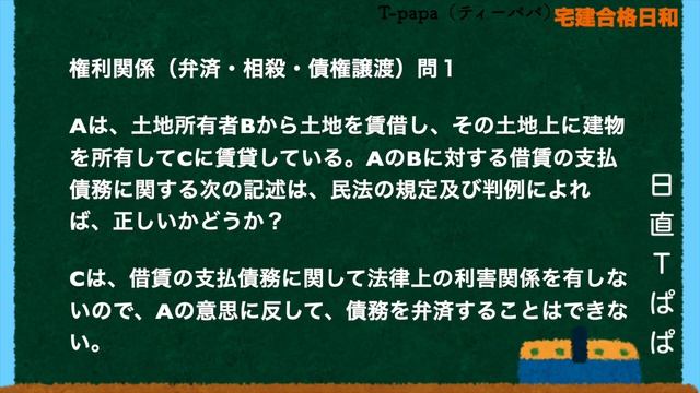 10月に向けて毎日頑張ろう!ᕦ(ò_óˇ)ᕤ 宅建士試験の合格に向けて、一緒に頑張りましょう! ( ´ ▽ ` ) 毎朝5時頃、動画のアップを頑張ってます。 (*´ー`*) 短い動画ばかりを作成しておりますので、 「再生リスト」から、「シャッフル再生」にて 繰り返しご利用くださいませ。 m(_ _)m 急いで進めずに、復習が大事ですよ! (^_−)−☆ ーーーーーーーーーーーーーーーーーーーーーーーーーーーーーー 本試験での科目 宅建業法 20問 (宅建業法19問+住宅瑕疵担保履行法1問) 権利関係 14問 (民法10問+借地借家法2問+区分所有法1問+不動産登記法1問) 法令上の制限 8問 (都市計画法2問+建築基準法2問+盛土規制法1問+土地区画整理法1問+農地法1問+国土利用計画法等1問) 税・その他 8問 (税法2問+価格の評定1問+住宅金融支援機構法1問+景品法1問+土地1問+建物1問+統計1問) ーーーーーーーーーーーーーーーーーーーーーーーーーーーーーー 学べば学ぶほど、自分がどれだけ無知であるか思い知らされる。 自分の無知に気づけば気づくほど、より一層学びたくなる。 By アルベルト・アインシュタイン ーーーーーーーーーーーーーーーーーーーーーーーーーーーーーー なお、十分な注意を払っておりますが、 もし法改正などにより、おかしな点があれば、 コメントにて教えて下さいませ。 皆さんの「合格」を心から願っております。 宅建合格日和 By T-papa (*´∇`*) ーーーーーーーーーーーーーーーーーーーーーーーーーーーーーー 本チャンネル「宅建合格日和」をよろしくお願いいたします。 チャンネルのホーム画面 https://www.youtube.com/channel/UC1_IrVykOkA2oqg-WftgJnw 再生リスト https://www.youtube.com/@Takken-T-papa/playlists 再生リスト:まとめ(シャッフル) https://www.youtube.com/playlist?list=PLNtyT9fm7MYHTnGnFpvtn4CTSX3skEGn3 再生リスト:全科目のまとめ https://www.youtube.com/playlist?list=PLNtyT9fm7MYHthoBU7m2IcFyA_aXa4cll 再生リスト:宅建業法 https://www.youtube.com/playlist?list=PLNtyT9fm7MYEL5flJ3BwHzZ8zPNnvNIv3 再生リスト:権利関係 https://www.youtube.com/playlist?list=PLNtyT9fm7MYFYZuG75lF6oTooSUN39wKY 再生リスト:法令上の制限 https://www.youtube.com/playlist?list=PLNtyT9fm7MYGW4hAT2z1llUN3M-U44jxj 再生リスト:税・その他 https://www.youtube.com/playlist?list=PLNtyT9fm7MYESamWfd4ZDdogvn_N_q7Dj ーーーーーーーーーーーーーーーーーーーーーーーーーーーーーー 別チャンネルの「アウトドア日和」も宜しくお願いいたします。 https://www.youtube.com/channel/UCr6DCwXnNzbAwq1d8PV9tnw ーーーーーーーーーーーーーーーーーーーーーーーーーーーーーー 【イラスト】 かわいいフリー素材集 いらすとや ーーーーーーーーーーーーーーーーーーーーーーーーーーーーーー 【ナレーション】 VOICEVOX:四国めたん VOICEVOX:ずんだもん ーーーーーーーーーーーーーーーーーーーーーーーーーーーーーー 【編集機材】 M1Pro MacBook Pro 16GBメモリ 1TB SSD 14inch ーーーーーーーーーーーーーーーーーーーーーーーーーーーーーー 【編集ソフト】 iMovie + Keynote ーーーーーーーーーーーーーーーーーーーーーーーーーーーーーー 【参考資料】 2023年度版 みんなが欲しかった!宅建士の教科書 TAC出版 2023年度版 みんなが欲しかった!宅建士の問題集 TAC出版 2024年度版 みんなが欲しかった!宅建士の教科書 TAC出版 2024年度版 みんなが欲しかった!宅建士の問題集 TAC出版 ーーーーーーーーーーーーーーーーーーーーーーーーーーーーーー 2022年 1月 9日:「アウトドア日和」チャンネル開設 2022年 1月10日:チャンネル登録者数1名(自分) 2022年11月11日:動画初投稿(頑張るぞー) 2023年 2月10日:チャンネル登録者数 10人( ´ ▽ ` ) 2023年 4月 9日:チャンネル休止(>人<;) ーーーーーーーーーーーーーーーーーーーーーーーーーーーーーー 2023年 1月 2日:「宅建合格日和」チャンネル開設 2023年 1月 5日:チャンネル登録者数1名(自分) 2023年 1月 7日:動画初投稿(頑張るぞー) 2023年 1月20日:初コメント( ´ ▽ ` ) 2023年 1月22日:チャンネル登録者数 10人( ´ ▽ ` ) 2023年 2月 4日:チャンネル登録者数 20人( ´ ▽ ` ) 2023年 2月10日:チャンネル登録者数 30人( ´ ▽ ` ) 2023年 2月23日:チャンネル登録者数 40人( ´ ▽ ` ) 2023年 3月 8日:チャンネル登録者数 50人( ´ ▽ ` ) 2023年 4月30日:チャンネル登録者数100人( ´ ▽ ` ) 2023年 6月29日:チャンネル登録者数150人( ´ ▽ ` ) 2023年 8月29日:チャンネル登録者数200人( ´ ▽ ` ) 2023年 10月 9日:チャンネル登録者数250人( ´ ▽ ` ) 2023年 10月12日:チャンネル登録者数260人( ´ ▽ ` ) 2023年 10月14日:チャンネル登録者数265人( ´ ▽ ` ) 2023年 10月15日:令和5年度 宅地建物取引士資格試験日(頑張れー!) 2023年 11月19日:チャンネル登録者数247人(>人<;) 2024年 1月10日:チャンネル登録者数265人( ´ ▽ ` ) 2024年 1月12日:チャンネル登録者数270人( ´ ▽ ` )