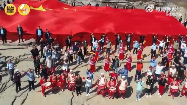 People sang and blessed the motherland with the #NationalFlag, rainbow, and Hukou Waterfall of the #YellowRiver in the same frame on Sept.30.