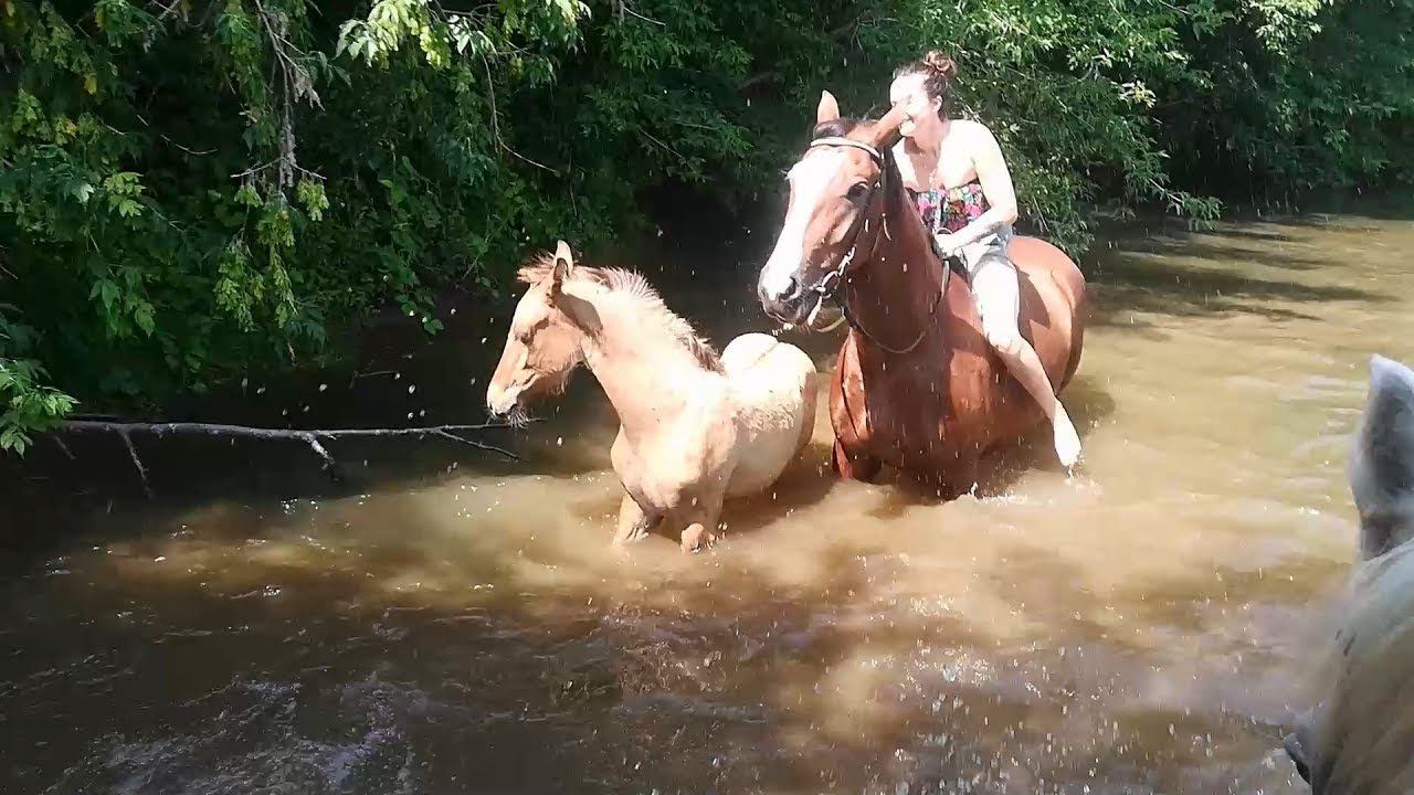 Купаемся на лошадях в реке, жеребенок первый раз плавает в воде