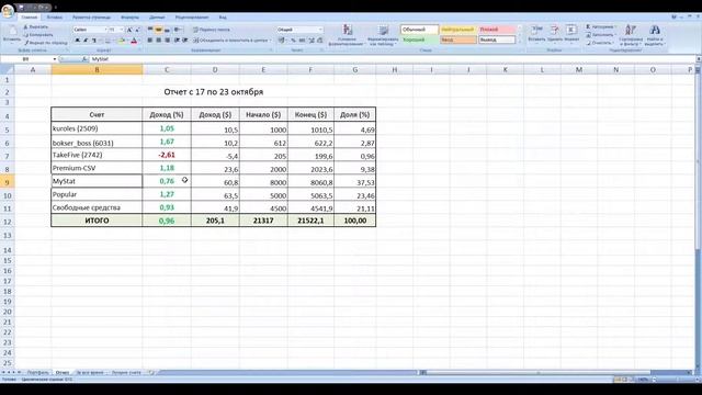 Зарабатываю 1-2% в неделю стабильно: http://goo.gl/rRj24j Блог о заработке в интернете - http://sumkadeneg.ru Отчет о результатах инвестирования в ПАММ счета за неделю с 17 по 23 октября 2016 года. Прибыль составила 0,96% или 205$. Досрочный выход из ПАММ индекса и упущенная прибыль. Как управляющие отбивают просадку и получают хорошую прибыль всего за неделю.