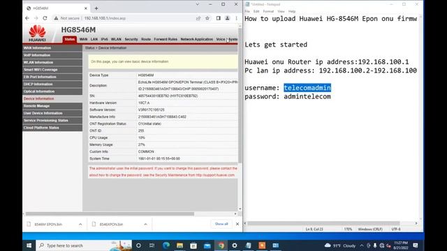 huawei HG-8010H onu firmware upload Huawei ONU ip address: 192.168.100.1 Pc lan ip address: 192.168.100.2-254 Username: telecomadmin Password: admintelecom Epon onu firmware google drive link: https://drive.google.com/drive/folders/1kb61syDqSzwmoL82PSlaTkJNevlJiB3T?usp=sharing