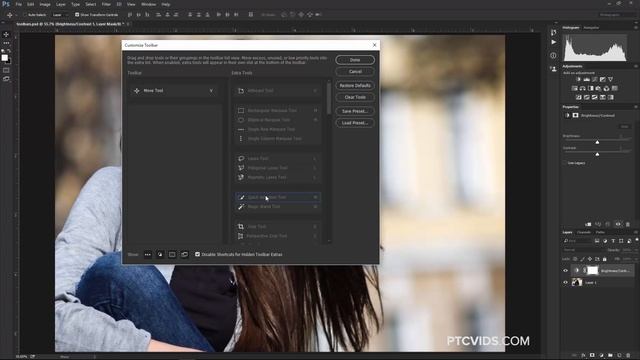 Photoshop CC 2015.1 tutorial showing how to customize the Toolbar. In this video I will show you how to customize the toolbar in Photoshop to only show the tools that you use most often, in order to enhance your workflow, and boost overall productivity. With the latest update to Adobe Photoshop CC 2015 you now have the ability to edit, reorder, or regroup the tools in your main toolbar. You can also create and save a custom toolbar within a custom Workspace, so that with each specific task you can have a specific set of tools at your disposal. In addition to editing the toolbar, you also have the ability customize keyboard shortcuts for each tool right from the Toolbar Customizer. If you have any questions please leave them below or head over to this tutorial's page on our website: https://photoshoptrainingchannel.com/how-to-customize-the-toolbar-in-photoshop Subscribe + Like + Share + Comment = More Video Tutorials! Thank you for watching! =================================== If you enjoyed this video be sure to subscribe to our newsletter to receive free weekly photoshop tips and more! Subscribe: http://ptcvids.com/subscribe For more in-depth Photoshop Tutorials be sure to check out our Premium tutorials. http://ptcvids.com/shop/ =================================== LINKS Website: https://photoshoptrainingchannel.com Facebook: https://www.facebook.com/PhotoshopTrainingChannel Instagram: http://instagram.com/jrfromptc LinkedIn: http://linkedin.com/company/Photoshop-Training-Channel Pinterest: http://pinterest.com/ptcpins YouTube Channel: https://www.youtube.com/user/photoshoptrainingch Google +: https://google.com/+Photoshoptrainingchannel This Video's Youtube Link: http://youtu.be/g7uf64MHmD8 Stock Images provided by: stock.adobe.com Photoshop video tutorials by Jesus Ramirez