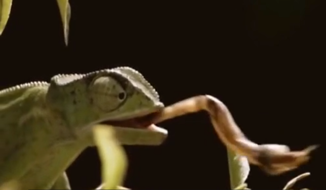 Язык хамелеона может вытягиваться на длину, превышающую длину тела. Когда хамелеон «выстреливает» языком, он зажмуривается, чтобы трепыхающаяся добыча не смогла травмировать его глаза. SV studio