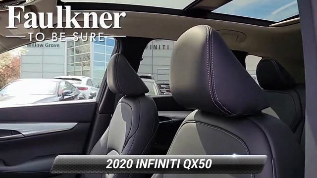 Certified 2020 INFINITI QX50 LUXE, Willow Grove, PA LF107644 https://www.faulknerinfinitiwillowgrove.com/VehicleDetails/certified-2020-INFINITI-QX50-LUXE_AWD-Willow_Grove-PA/5585785480 http://www.faulknerinfinitiwillowgrove.com/ For more information on this vehicle and our full inventory, call us at (215)-315-3353 Faulkner Infiniti of Willow Grove 1510 Easton Rd Willow Grove, PA 19090 Certified. CARFAX One-Owner. 2020 INFINITI QX50 LUXE***HEATED SEAT PACKAGE $550.00 VALUE******NAVIGATION PACKAGE $700.00 VALUE******19"WHEELS******PANORAMIC MOONROOF******POWER REAR LIFTGATE******PADDLE SHIFTERS******BLIND SPOT WARNING******LANE DEPARTURE WARNING******REARVIEW MONITOR******REAR AUTOMATIC BRAKING******REAR CROSS TRAFFIC ALERT******APPLE CARPLAY & ANDROID AUTO******FRESH PA INSPECTION & OIL CHANGE******CERTIFICATION INSPECTION******NEW FRONT & REAR BRAKES******4 BRAND NEW TIRES***Apple CarPlay/Android Auto, Blind Spot Warning, Front Bucket Seats, Heated Front Seats, Illuminated entry, Navigation System, Power Liftgate, Power moonroof, Wheels: 19"x 7.5J Silver Painted Aluminum Alloy. [RLVID:5651:51ffd61a44dd2c10:42e4cde59b2a4a4a:1]