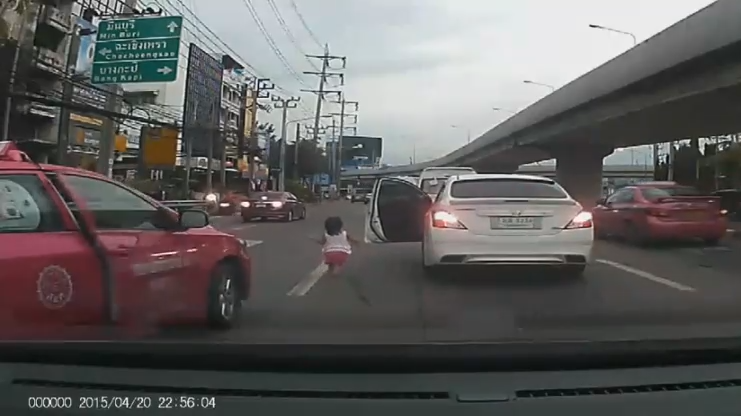 В Таиланде на оживленной дороге маленькая девочка случайно открыла дверь машины и выпала из неё. Чтобы не повторять таких ошибок родителей, всегда закрывайте двери машины, когда едете с ребенком, а лучше пользуйтесь детскими креслами.