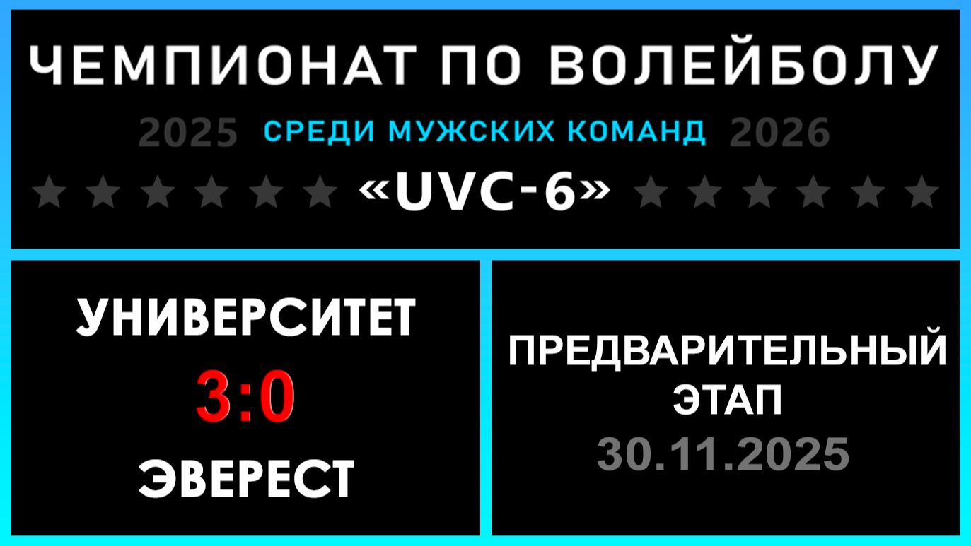 UVC-6 (Мужчины): Чемпионат UVC Лиги по волейболу среди мужских команд 2025-2026 гг. Результаты игры: Предварительный этап 30.11.2025 Университет - Эверест 3:0 (25:20, 25:21, 25:17) Фокин Никита получил приз лучшего блокирующего ТОР дивизиона (за прошлый сезон), а затем лучше всех подавал в игре! 😅 Университет не испытал каких-то сложностей, одержав уверенную победу, дальше команде предстоит Групповой этап в LEVEL TOP! Эверест провалил прием, поэтому навязать борьбу не получилось. «РЕШАЛЫ» - конкурс для команд : ✅ Эверест идет дальше! «Nostradamus trophy» - конкурс для участников группы ВКонтакте: ✅ 28 - количество участников, которые смогли предсказать точный исход матча! #UVC_ЛИГА_ЧЕМПИОНАТ_UVC_6_Мужчины