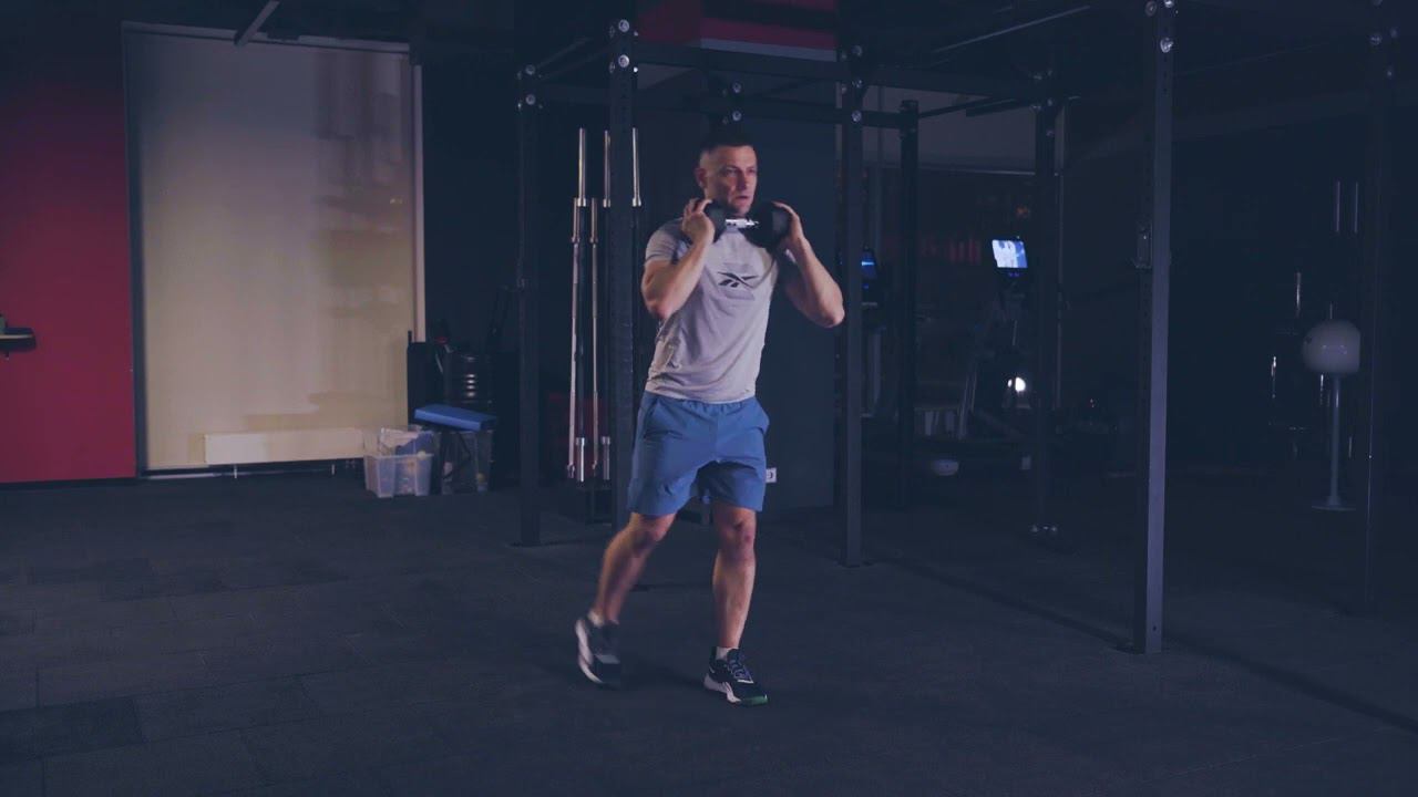 Попеременные выпады шагом назад с гантелью на груди/alt reverse lunge front rack db