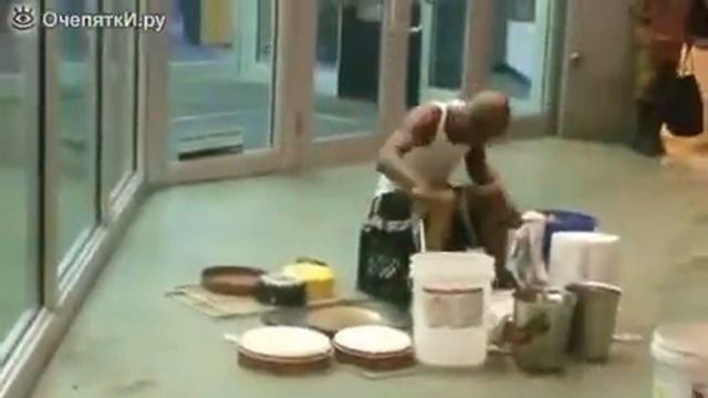 Очень увлечённый и энергичный талантливый барабанщик, который в качестве барабанной установки, не долго думая, стал использовать пластиковые вёдра, кастрюли, жестяные детали, дающие нужные звуки, смотреть видео прикол онлайн "Увлечённый энергичный барабанщик". Источник: http://ochepyatki.ru/view_video.php?viewkey=bac6ab6