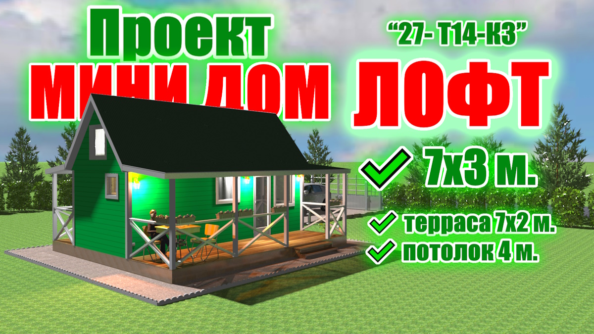 Проект недорогого дачного дома с лофт, антресольным этажом и террасой. Проект "ЛОФТ 27- Т14-К3". Это недорогой, удобный дачный дом с высоким потолком и “лофт”, антресольным этажом. #дачный #дом #лофт Основные особенности и характеристики дома. ✔ Данный дом является, небольшим, можно сказать “мини домом”. Размер теплого контура: 7 на 3 метра. ✔ Потолок в доме подшит по стропилам, по кровле, высота в коньке порядка 3,9 метра. Благодаря такому потолку в доме очень свежо, ощущается объем и при правильном расположении окон очень светло и уютно. ✔ В проекте дома присутствует “лофт”, антресольный этаж, размером 3 на 2 м. 💥Но самое главное, что это быстровозводимый дом и строится он 💥за 1-2 дня на вашем участке. ✔ Такая скорость строительства достигается путем применения в строительстве дома каркасно-щитовой технологии, при которой все стены и перегородки мы привозим к вам на участок уже в готовом виде. А профессиональная бригада строителей собирает и комплектует дом, быстро и качественно. ✔ Для наружней отделки в большинстве случаев мы используем имитацию бруса. ✔В проекте дома присутствую две крытые террасы. Первая небольшая 1,5 на 2 метра при входе в дом. И просторная терраса 7 на 2 метра с опорами из бруса. ✔ В качестве укрывного материала мы предлагаем использовать ондулин, или металлочерепицу. ✔ В данном проекте мы предусмотрели большое количество окон: 7 шт. включая форточку. При вашем желании количество и размеры окон можно менять индивидуально. ✔ Основной вход в дом осуществляется с небольшой террасы, крыльца 1,5 на 2 метра. ✔ Входная дверь металлическая с двух сторон, производство Россия. ✔ Планировка данного дома простая, но в тоже время очень функциональная и удобная. ✔ Войдя в домик вы попадаете в тамбур 2,44 м.кв., он же гардеробная с большим шкафом. Тамбур позволяет отсечь холодный воздух с улицы и не дать ему попасть в основное, жилое пространство дома. ✔ В тамбуре установлены две деревянные, внутренние двери. Одна из которых ведет в совмещенный санузел а вторая в основное жилое помещение. ✔ Санузел совмещенный небольшой, площадью 2,86 м.кв. но в целом в нем можно разместить все необходимое - душевую кабину, унитаз, стиральную машинку, раковину, водогрей, сушилку для полотенец и форточку для проветривания. ✔ Войдя во вторую дверь из тамбура, вы попадете в основную, жилую комнату “студию” площадью 13 м.кв. В комнате можно расположить обеденную зону со столиком и стульями, спальное место в виде дивана, или кровати, кухонную зону. В данном помещении очень высокий потолок, подшитый по стропилам крыши, в коньке высота 3,9 м. ✔ Над тамбуром и санузлом оборудован “лофт”, антресольный этаж 5,44 м.кв.и на котором можно расположить просторное спальное место, телевизор и сопутствующие мебель и атрибуты. Для доступа на антресольный этаж можно использовать лестницы разных типов, мы предлагаем использовать крутую лестницу с поручнем (перилами), это позволит сэкономить место и в тоже время обеспечить комфортный доступ наверх. ✔ Конкретно в этом проекте окна ПВХ, стеклопакеты следующих размеров: 900 на 1100 мм., 800 на 800 мм., и 500 на 500 мм. На нижнем уровне дома установлены окна 900 на 1100 мм. в количестве 3 штук. а также окно 800 на 800 мм. в кухонной зоне и форточка 500 на 500 мм. в санузле. И на верхнем уровне во фронтонах установленны окна 800 на 800 мм. ✔ Из основной комнаты че
