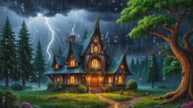 ⛈️Расслабляющие звуки дождя и грома в эльфийском лесу с домиком для отдыха и сна, учебы и медитации