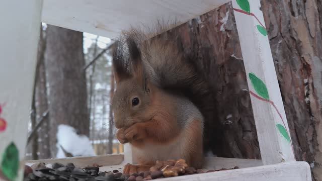Рыжик ест в кормушке
